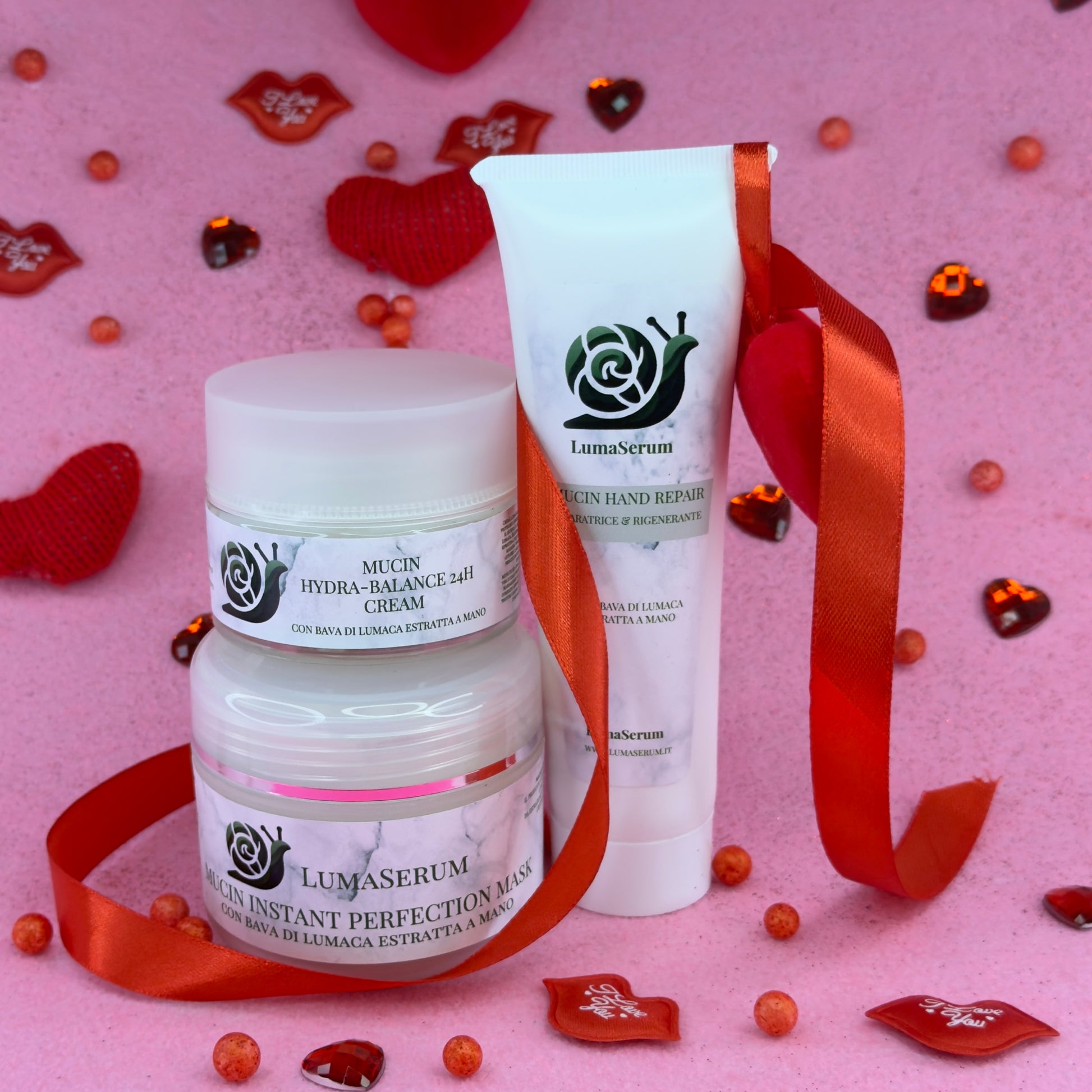 Acqua, Alcol Cetilico (emolliente), Dicaprylyl Carbonate (emolliente leggero), Glicerina, Emulsionante, Bava di Lumaca (Helix Aspersa), Vitamina E Acetato, Elastina Idrolizzata, Estratto di Ippocastano, Estratto di Centella Asiatica, Estratto di Ortica, Glicole Propilenico, Profumo, Glucosio, Sorbitolo, Sodio Glutammato, Acido Ialuronico (Sodio Ialuronato), Glicole Pentilenico, Urea, Glicina, Proteine del Grano Idrolizzate, Acido Lattico, Pantenolo (Provitamina B5), Limonene, Alcol Benzilico, Etilesilglicerina.